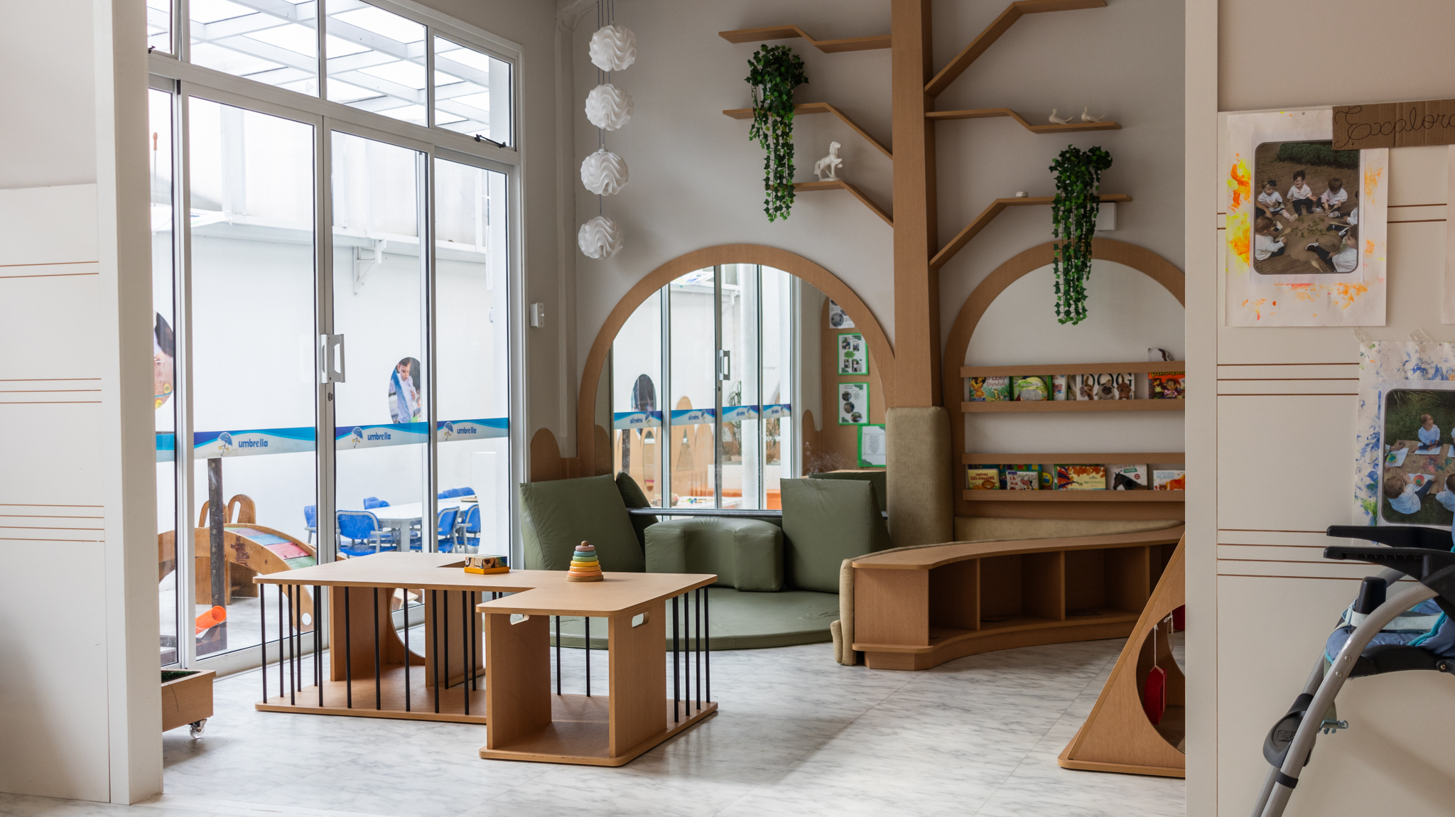 Tratamos o espaço como terceiro educador e ativador da aprendizagem, com múltiplas possibilidades, territórios desafiadores e alegres. Aqui, todos têm responsabilidades compartilhadas em cuidar do espaço físico da escola, construindo valores que permanecerão para a vida toda.